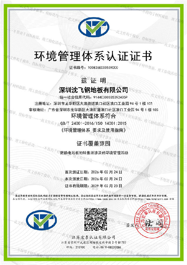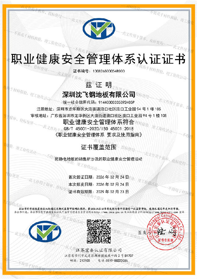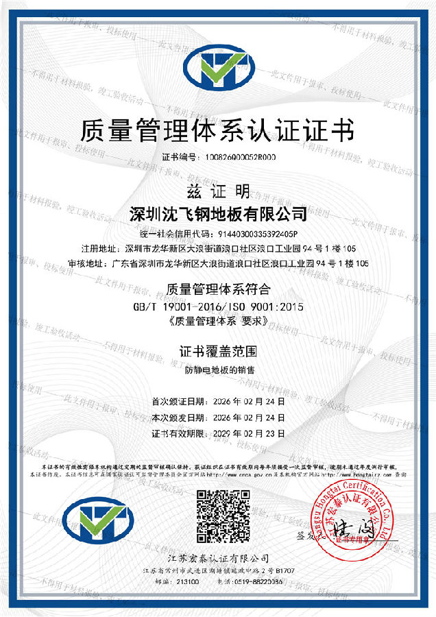 近日,深圳沈飞钢地板有限公司顺利通过全面审核,于2026 年 2 月 24 日成功续签ISO9001、ISO14001、ISO45001三大国际管理体系认证。